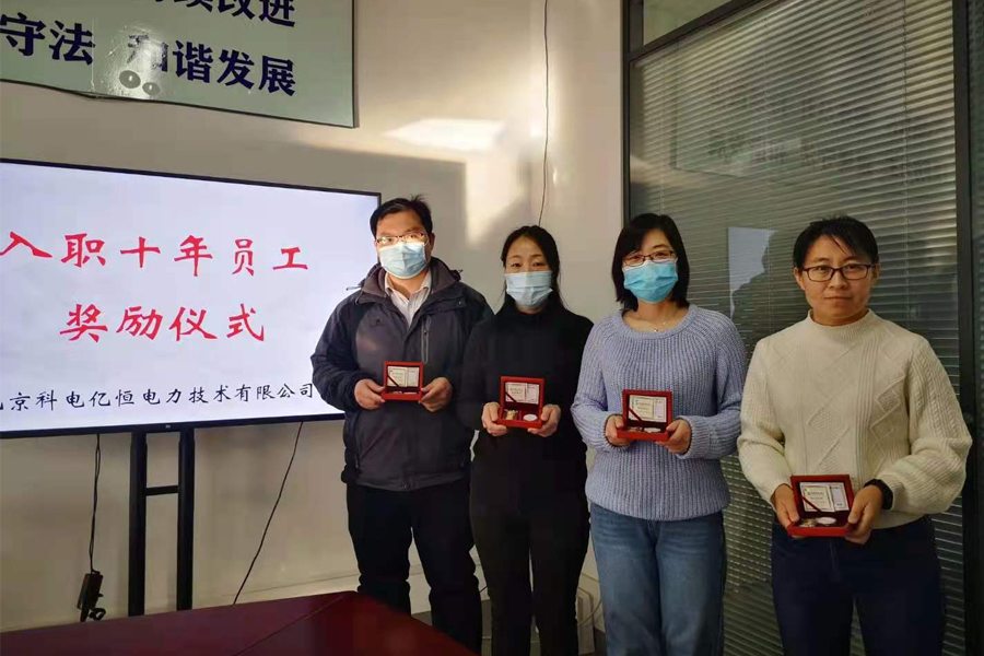 2020年,在熱烈的掌聲中,北京科電億恒電力技術有限公司總部張燈結彩,喜氣盈盈。科電億恒總經理、市場部、銷售部、研發部、行政部等部門全體人員歡聚一堂,共同見證公司一年一度的“科電億恒入職十年員工獎勵儀式”的成功舉辦!總經理出席了本次頒獎儀式,并代表公司向獲獎員工頒發“2020年度科電億恒-入職十年員工獎”。